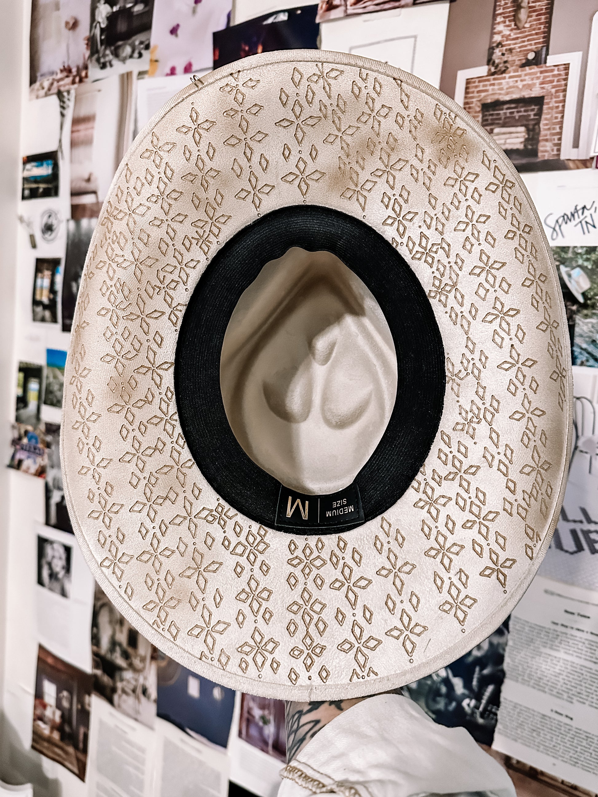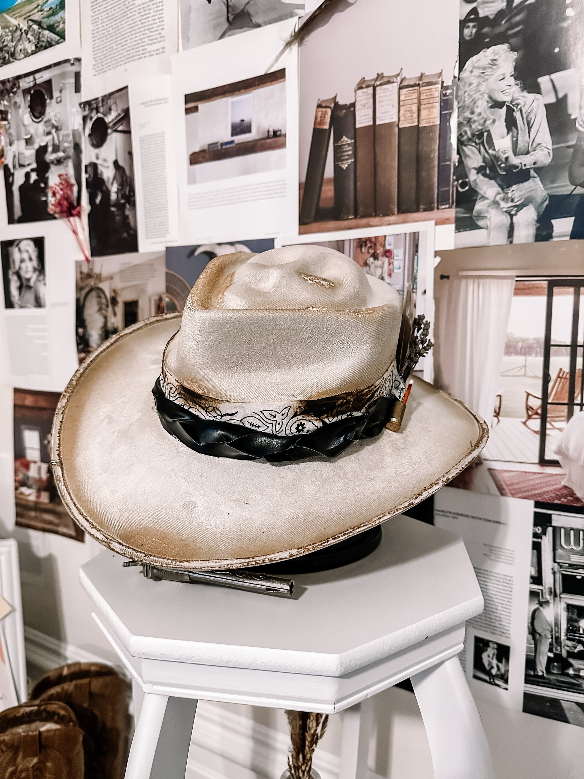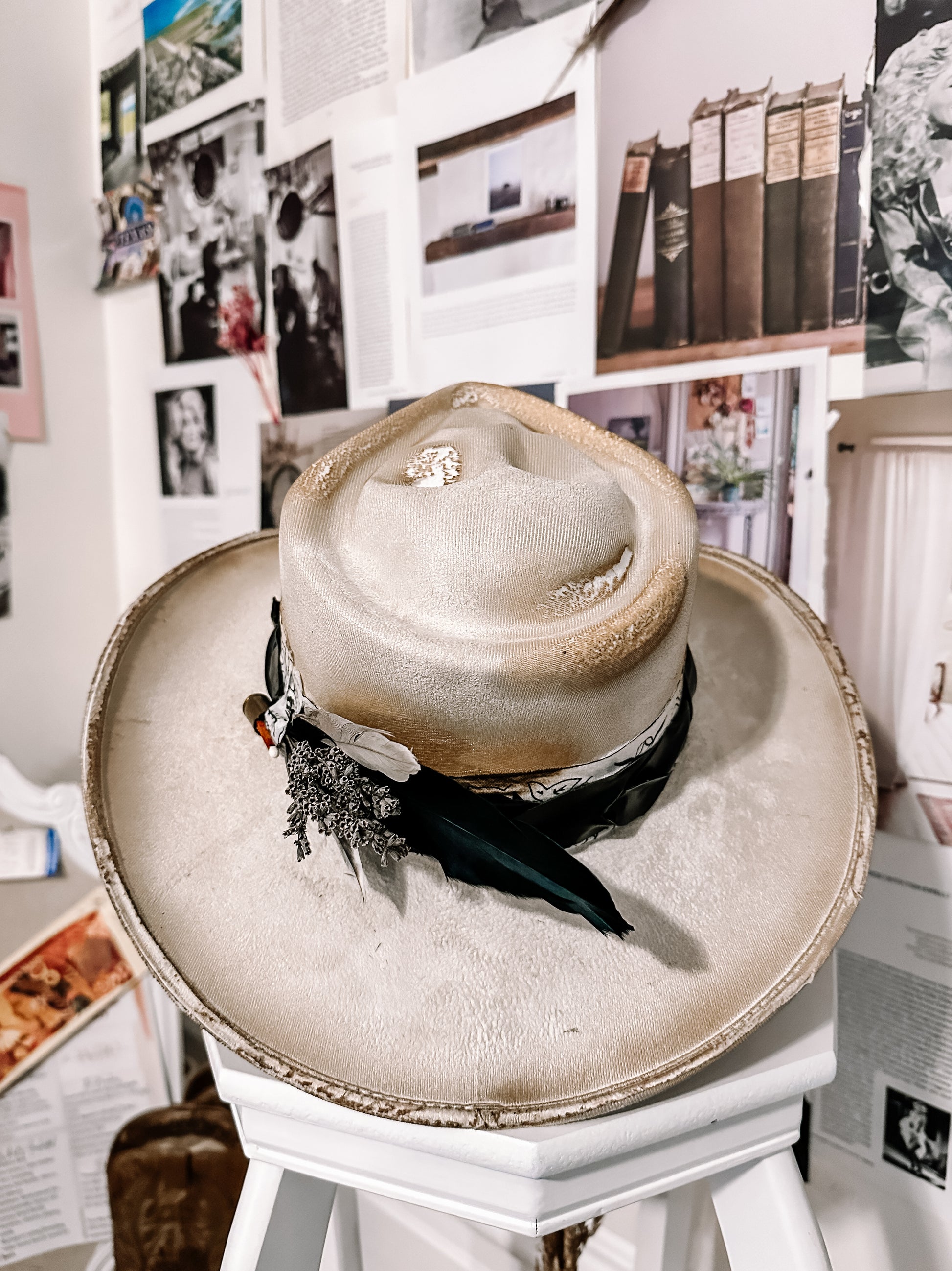 featuring small bullet casing vase with local dried lavender and duck feathers. hand burned designs on the underside.