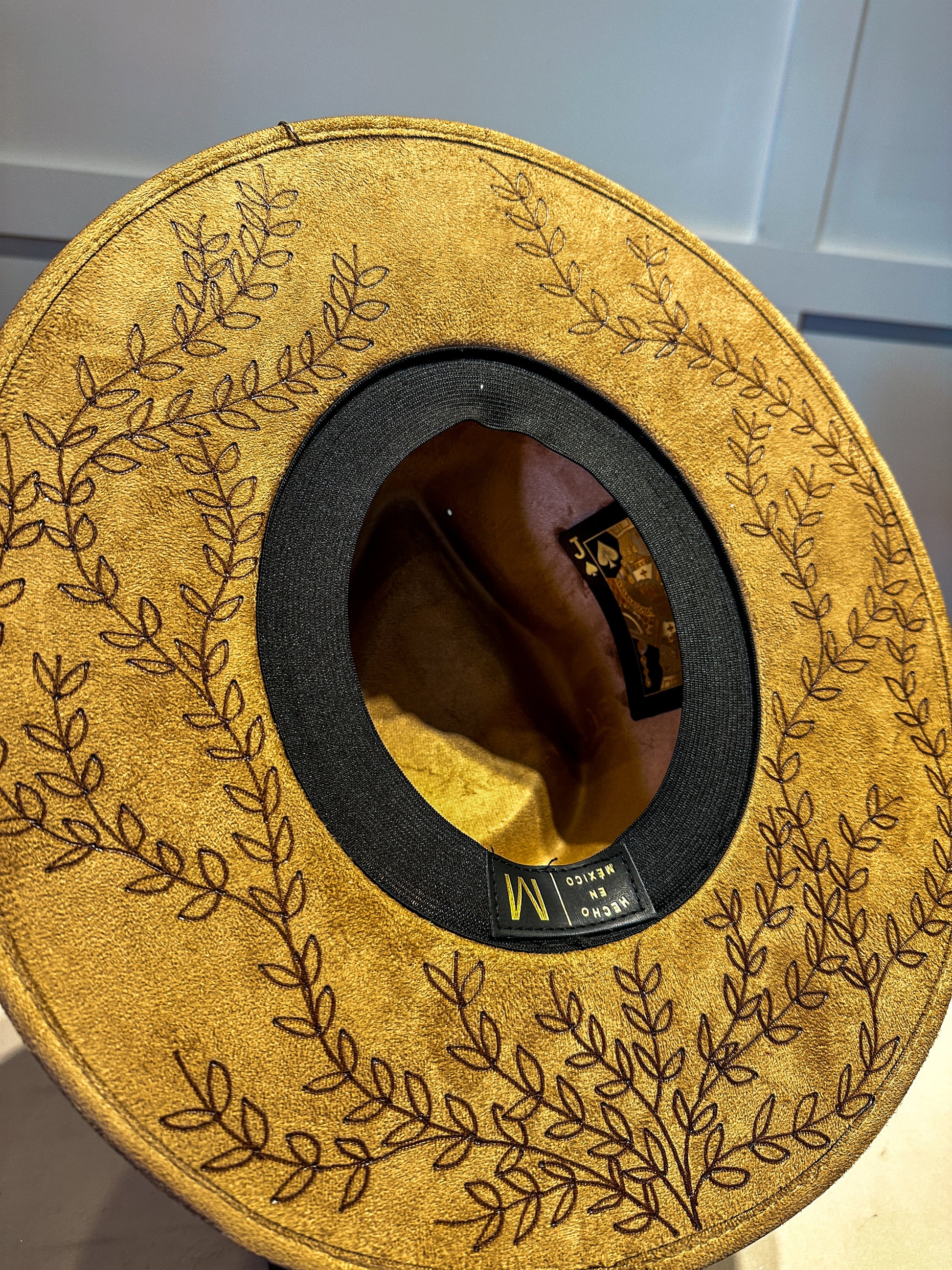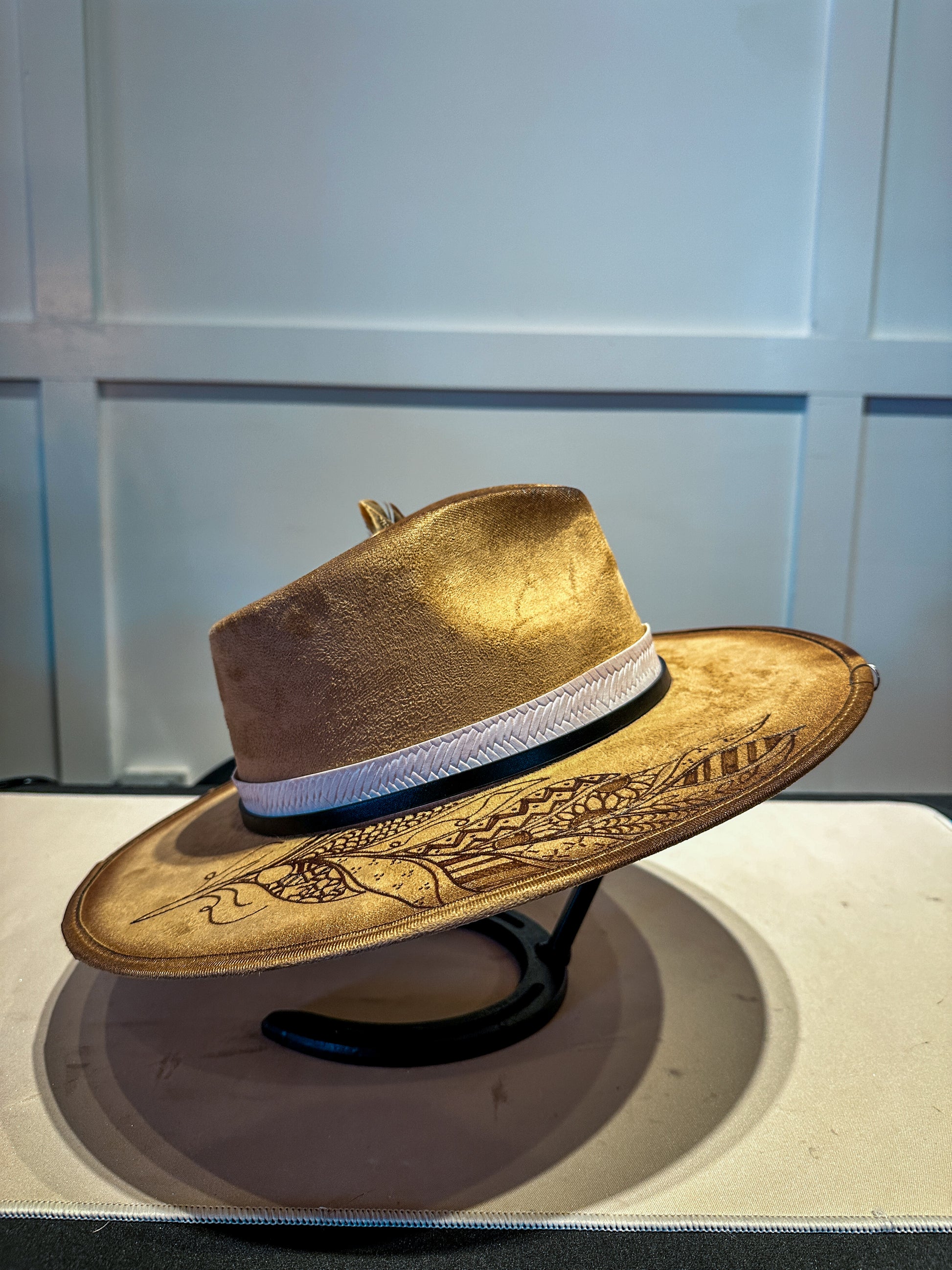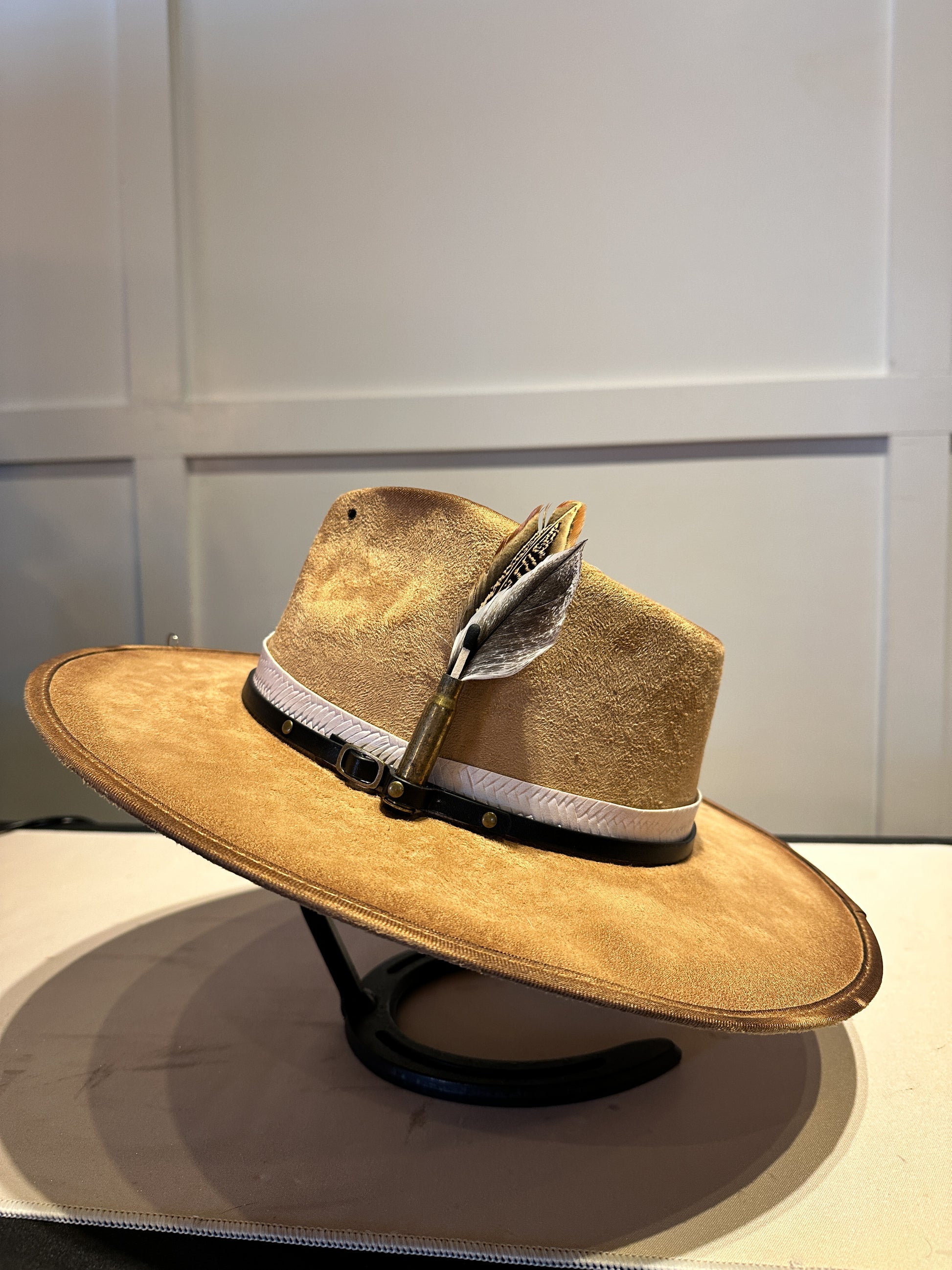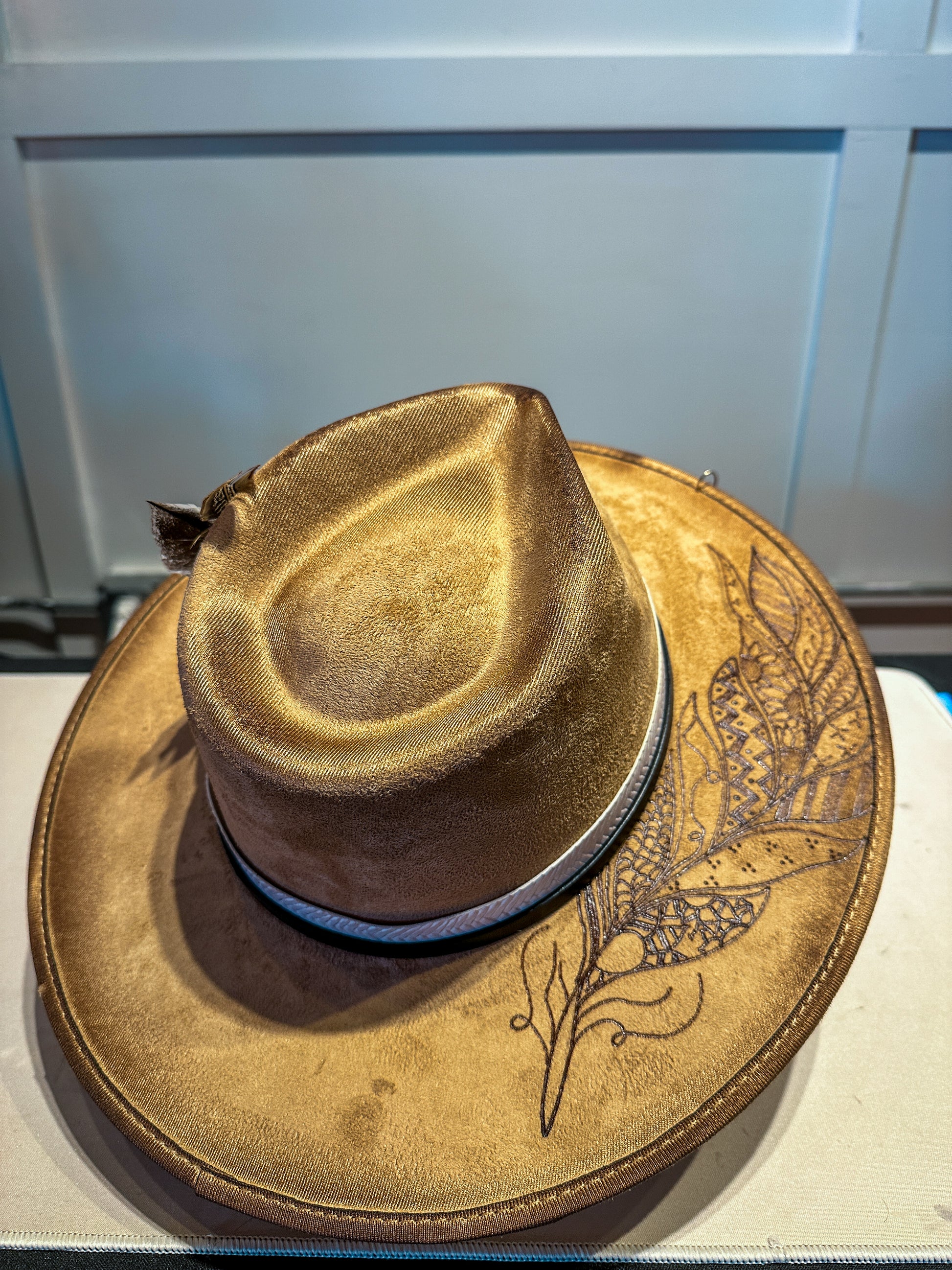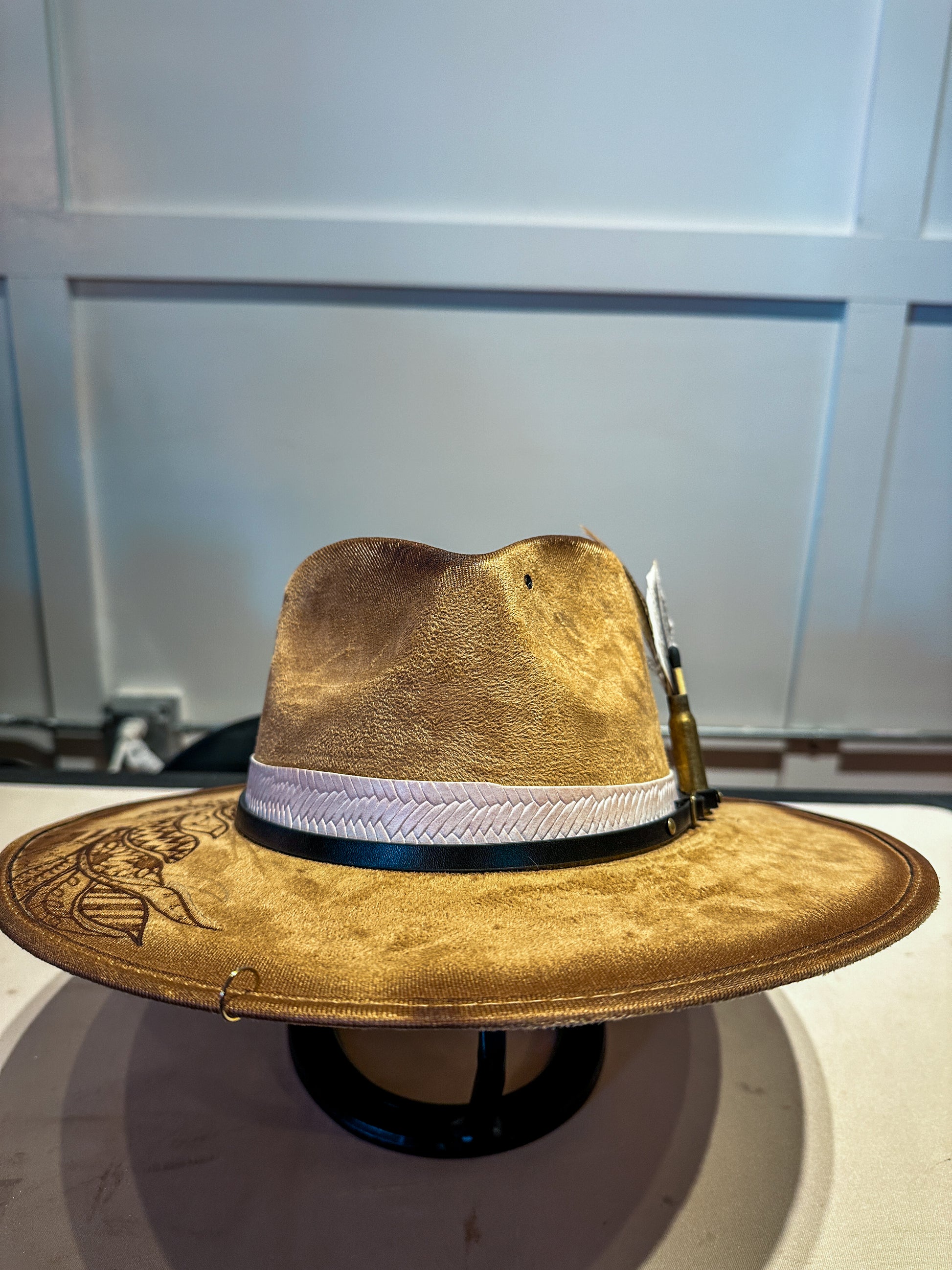 Color: camel, vegan suede featuring hand burned designs and a bullet casing floral vase